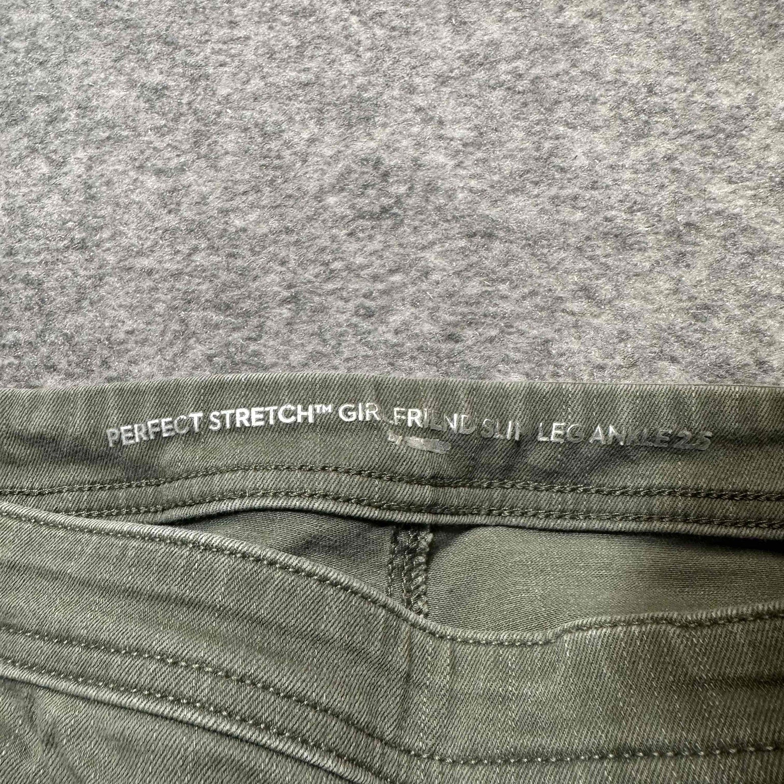 Features: Olive Green, Perfect Stretch, Slim Ankle, Girlfriend Style, Five-Pocket Design