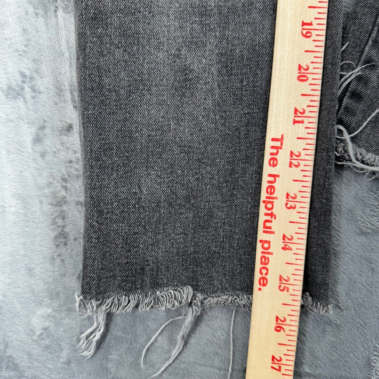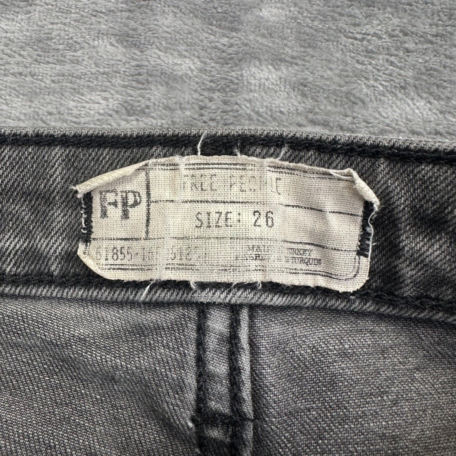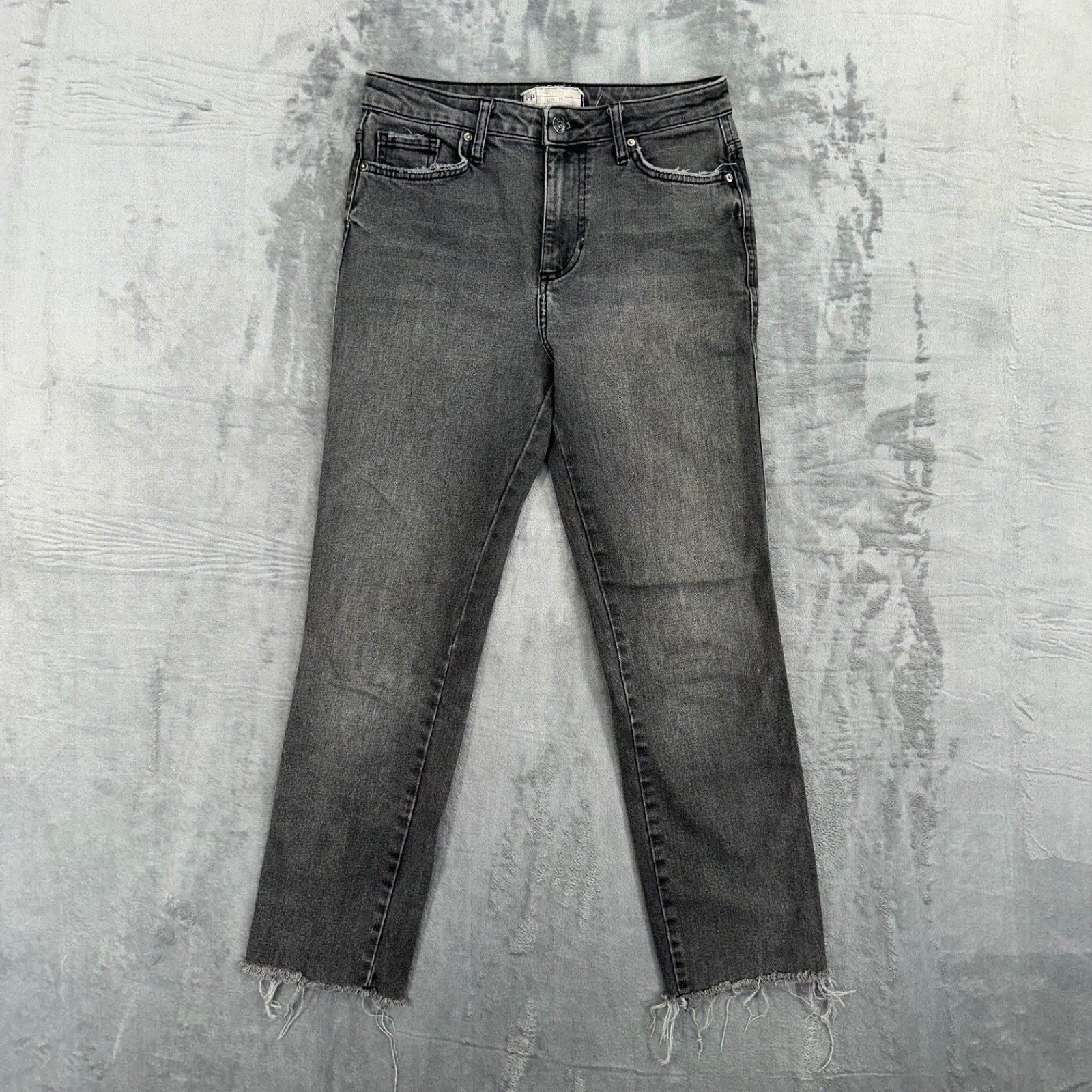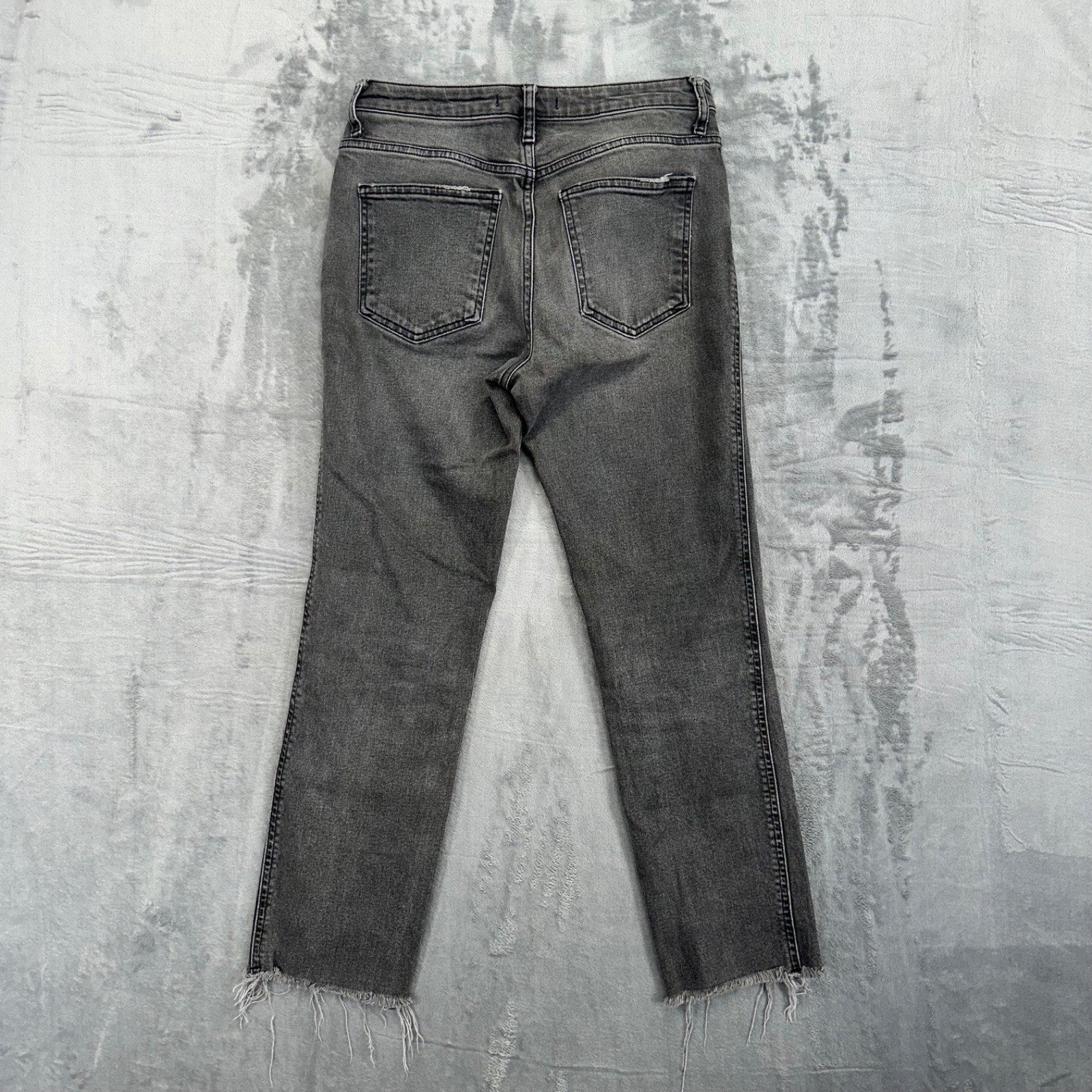 Free People women's jeans in a medium wash gray denim. High-rise fit with a zip closure and frayed hem. Pre-owned condition, see photos for details.