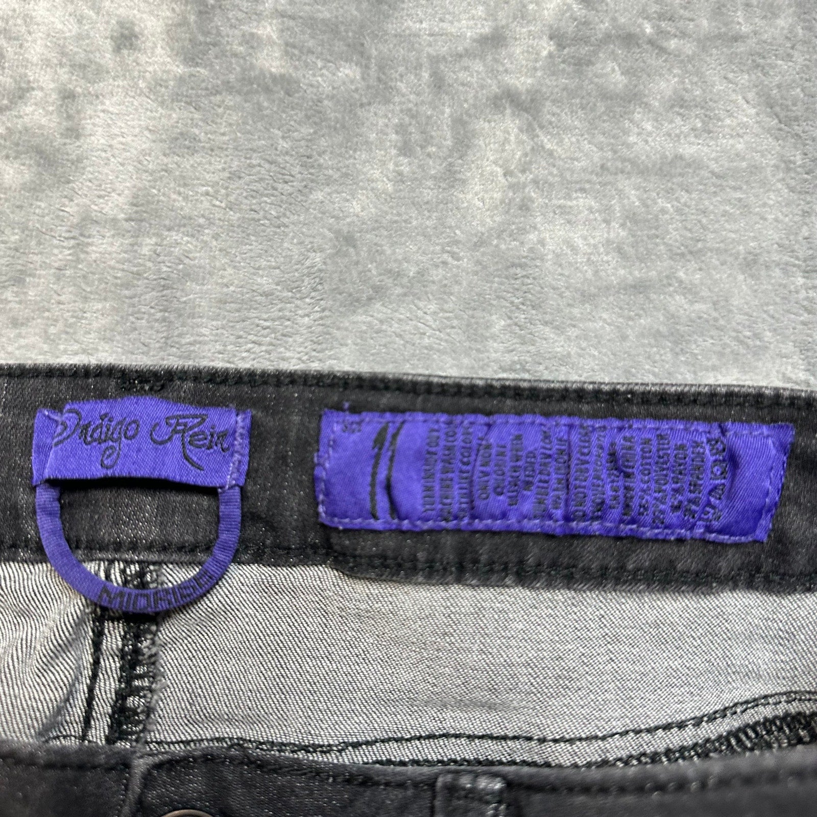 For sale: Women's Indigo Rein Two Tone Duo Tone Skinny Jeans in size 11, regular. Pre-owned in excellent condition. These stylish jeans feature a sleek black and gray color scheme. Measurements include a 30" waist, 28" inseam, and 9" rise. A perfect addition to any wardrobe, offering a comfortable fit and versatile style.