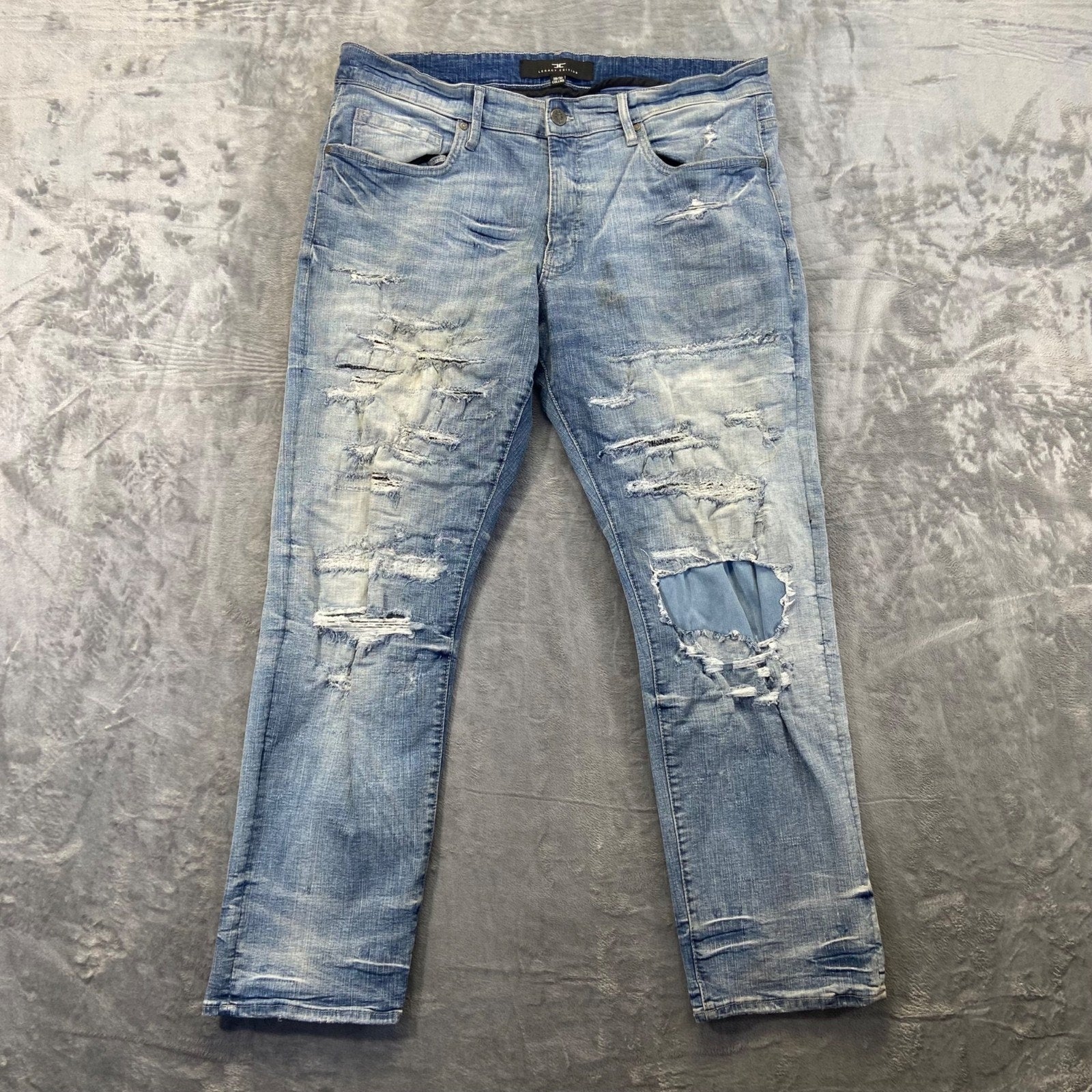 Jordan Craig men's distressed straight jeans in a light wash, size 38x32.